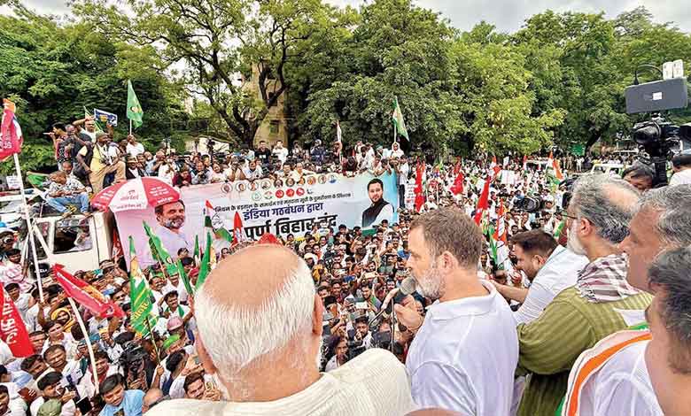 اپوزیشن مہاگٹھ بندھن کے سرکردہ قائدین بشمول راہول گاندھی‘ ریاستی دارالحکومت پٹنہ میں جمع ہوئے۔ انڈیا بلاک جس میں مہاگٹھ بندھن شامل ہے‘ ملک گیر چکہ جام ہڑتال کی تائید کررہا ہے لیکن اس نے بہار میں الیکشن کمیشن کی مہم کے خلاف بھی احتجاج کیا۔