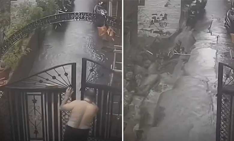 یہ ویڈیو ایک گھر کے بیرونی دروازے (مِین گیٹ) کا ہے۔ ویڈیو میں دیکھا جا سکتا ہے کہ بارش کے بعد ایک شخص گیٹ کے قریب کھڑا ہے۔ اچانک گیٹ خود بخود کھل جاتا ہے۔ وہ شخص فوراً گیٹ کو بند کرنے کی کوشش کرتا ہے۔ ابھی وہ گیٹ بند ہی کر رہا ہوتا ہے کہ اچانک بائیں جانب کا دروازہ اور اس کے ساتھ موجود دیوار زمین بوس ہو جاتی ہے۔