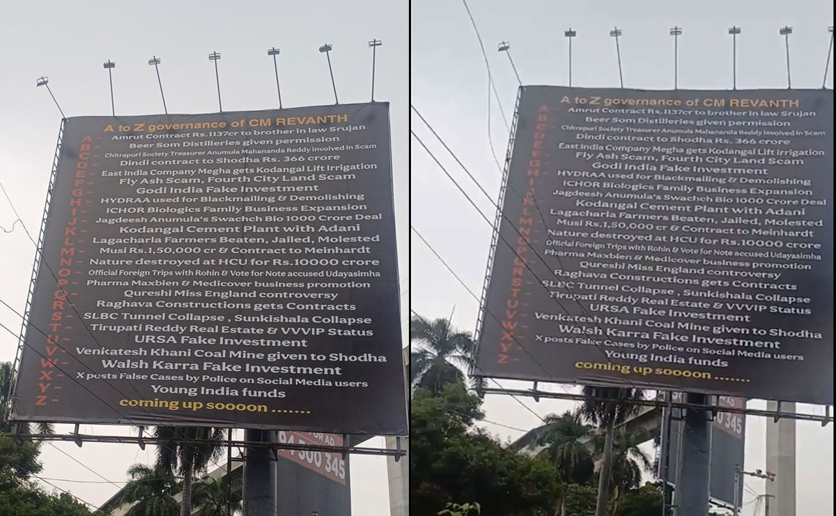 یہ ہورڈنگس جوبلی بس اسٹاپ کے قریب بھارت راشٹرا سمیتی (بی آر ایس) کے رہنماؤں کی جانب سے نصب کیے گئے ہیں۔ ان میں مزید دعویٰ کیا گیا ہے کہ کانگریس کے اقتدار میں زمینوں میں گھپلے، غیر قانونی کاروبار، کسانوں پر حملے، جعلی سرمایہ کاری اسکیمیں،غیرمجاز انہدامی کارروائیاں جیسے معاملات عام ہو چکے ہیں۔