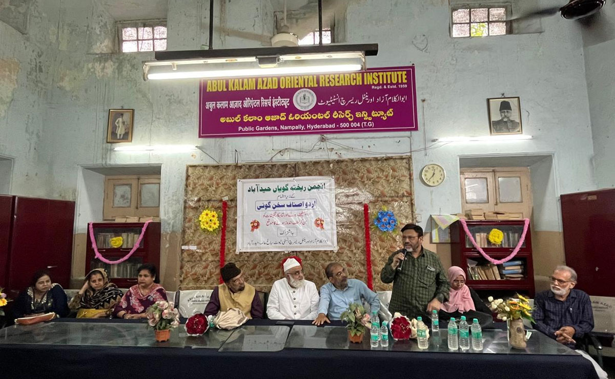 حیدرآباد: انجمن ریختہ گویان حیدرآباد کے زیر اہتمام مولانا آزاد اورینٹل ریسرچ انسٹیٹیوٹ نامپلی میں ایک ادبی نشست کا انعقاد عمل میں آیا، جس میں شعرا، ادیبوں اور محبانِ اردو نے بڑی تعداد میں شرکت کی۔ اس نشست کا مقصد اصلاحِ معاشرہ میں اردو ادب کے کردار اور اردو زبان کے فروغ پر زور دینا تھا۔