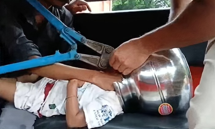 نئی دہلی: نئے برتن سے کھیلتے ہوئے تین سالہ بچے کا سر اس میں پھنس گیا ، دو گھنٹے کی مشقت کے بعد بحفاظت برتن سے سر کو باہر نکالنے میں کامیابی حاصل کی گئی۔ یہ عجیب و غریب واقعہ اڈیشہ-آندھرا پردیش کی سرحد پر واقع ملکانگیری ضلع میں پیش آیا۔