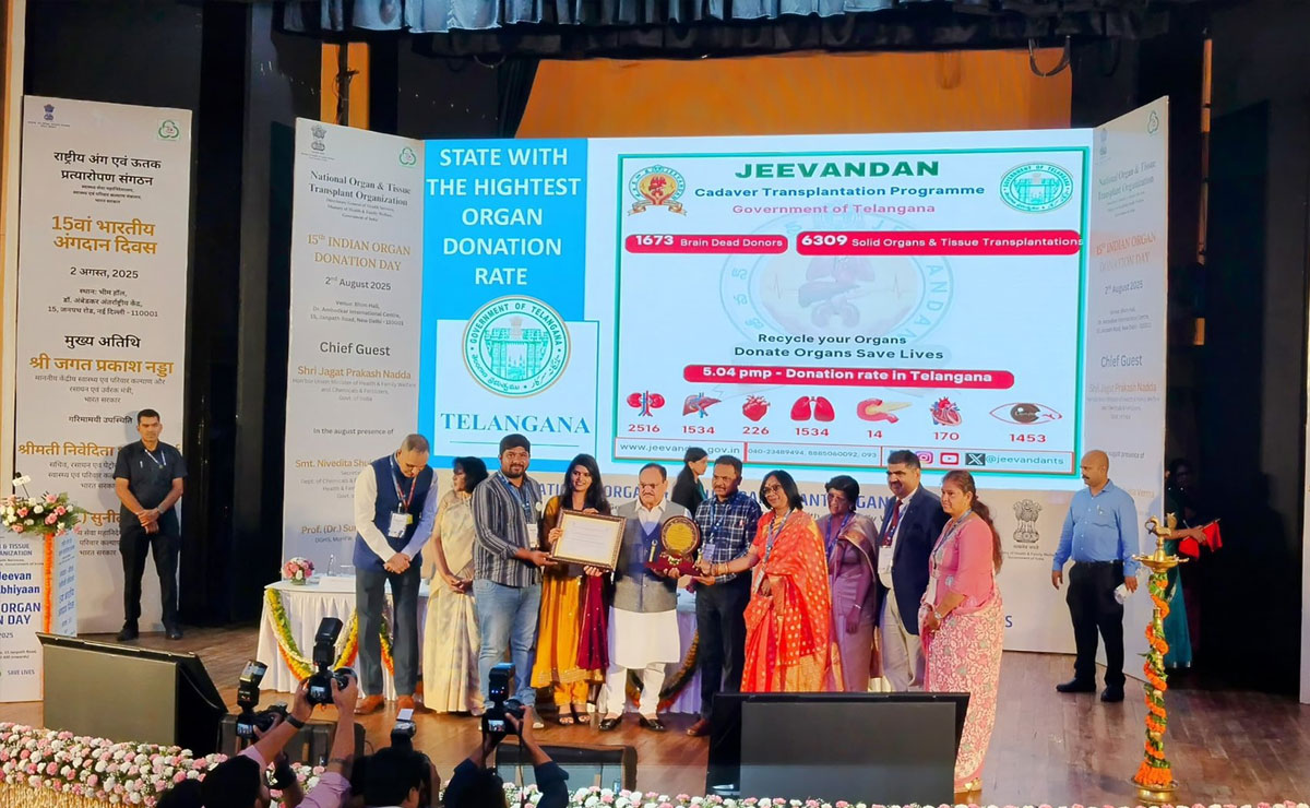 مرکزی وزارتِ صحت کے مطابق 2024 میں ہر دس لاکھ آبادی پر ملک میں اوسطاً 0.8 اعضاء کے عطیات ریکارڈ کیے گئے، جبکہ تلنگانہ میں یہ شرح 4.88 رہی، جس کی بنیاد پر ریاست نے ملک میں پہلا مقام حاصل کیا۔ اس کامیابی پر نیشنل آرگن اینڈ ٹشو ٹرانسپلانٹیشن آرگنائزیشن (نوٹو) کی جانب سے تلنگانہ کو ایوارڈ بھی دیا گیا۔