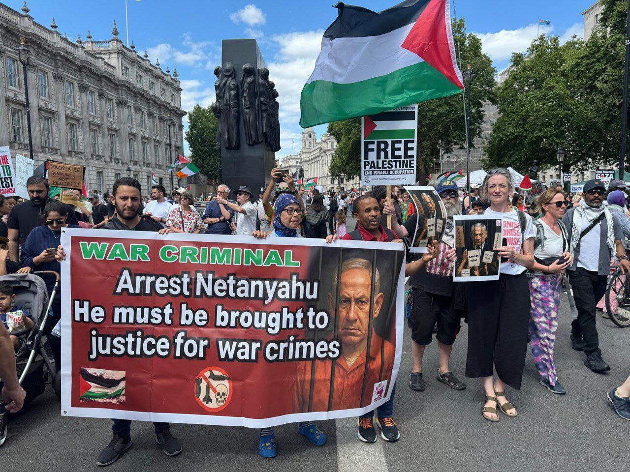 مظاہرین نے حکومت برطانیہ سے مطالبہ کیا کہ وہ نتن یاہو کو جنگی جرائم کا مرتکب قرار دے کر قانونی کارروائی کرے۔