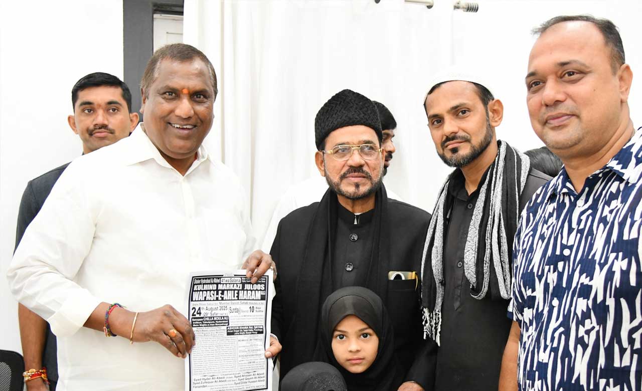 وفد نے وزیر موصوف کو 41ویں سالانہ آل انڈیا سنٹرل جُلوُسِ واپسی اہلِ حرم میں بطور مہمانِ خصوصی شرکت کی دعوت دی اور علمِ مبارک کی گل پوشی پیش کی۔