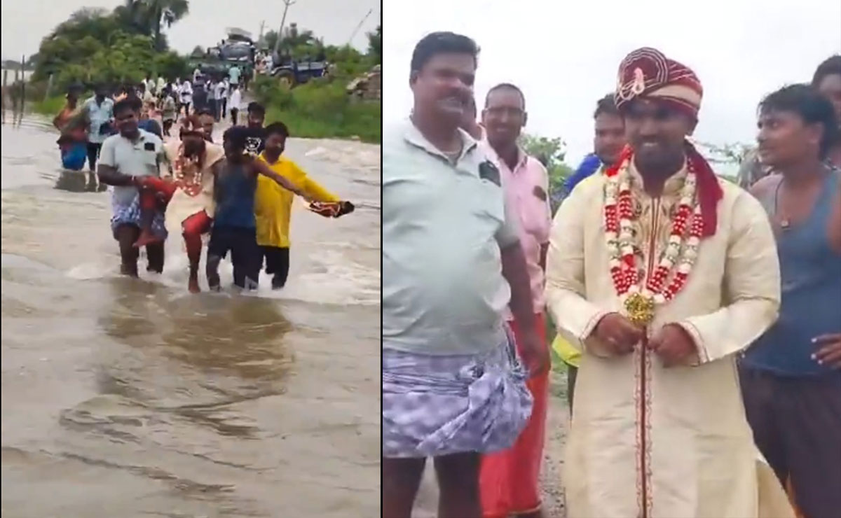 حیدرآباد: تلنگانہ کے کریم نگر ضلع کے گنے ورم گاؤں میں ایک دلچسپ اور غیر معمولی منظر اُس وقت دیکھنے کو ملا جب شدید بارش سے پیدا سیلابی پانی کے باعث دلہا کو اس کے رشتہ داروں نے اپنے کندھوں پر اٹھا کر پار پہنچایا۔