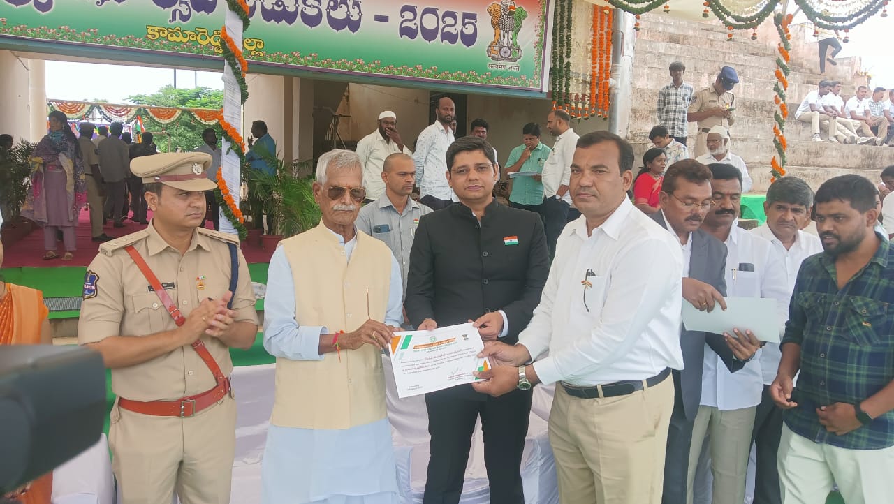 کاماریڈی 15/ اگست(اردو لیکس) اندرا گاندھی اسٹیڈیم کاماریڈی پر ضلع کلکٹر ، ایس پی و دیگر عہدیداروں کی موجودگی میں جشن یوم آزادی ہند کے موقع پر مہمان خصوصی ایم ۔ کودنڈا ریڈی ، چیرمین تلنگانہ زراعت و کسان بہبود کمیشن ، کے ہاتھوں نمایاں خدمات کا اعتراف