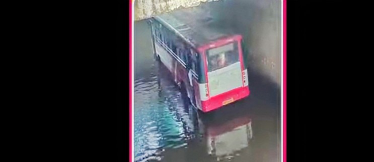بس انڈر پاس روڈ پر بارش کے پانی میں پھنس گئی۔ تلنگانہ کے میدک ضلع میں واقعہ