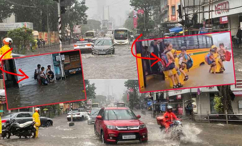 Heavy rains caused severe waterlogging in Mumbai’s Matunga area, leaving a school bus stranded.