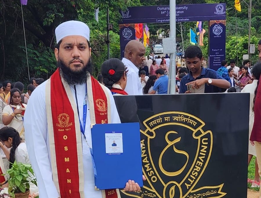 حیدرآباد ۔ عثمانیہ یونیورسٹی کے 84 ویں کانوکیشن میں حافظ سيد عبد الحميد کو پی ایچ ڈی کی ڈگری عطا کی گئیعثمانیہ یونیورسٹی کے 84 ویں سالانہ کنوکیشن کی پروقار تقریب میں حافظ سيد عبد الحميد کو پی ایچ ڈی کی ڈگری سے نوازا گیا۔