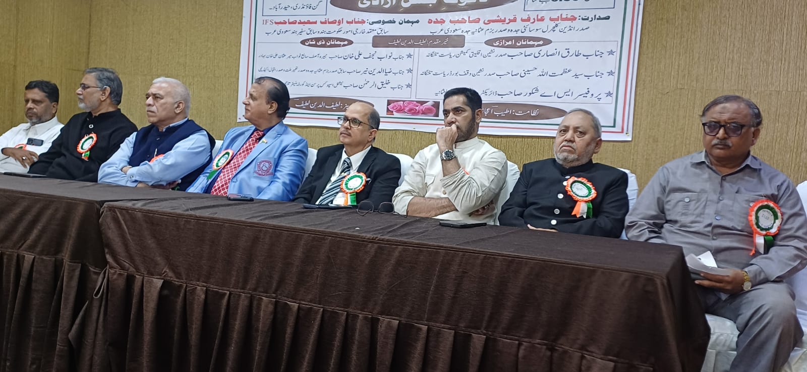 کمیشن،پروفیسر ایس اے شکور ڈائریکٹر دائرۃ المعارف عثمانیہ یونیورسٹی اور نواب نجف علی نبیرہ آصف سابع میر عثمان علی خان بہادر نے شرکت کی جناب عارف قریشی صدر انڈین کلچرل سوسائٹی جدہ بزم عثمانیہ جدہ سعودی عرب نے اپنی صدارتی تقریر میں کہا کہ ہم 50 سال سے اپنے ملک سے دور رہنے کے باوجود حب الوطنی کاجذبہ،شہر کی تہذیب و بھائی چارگی کو بھول نہیں سکے۔ ہر سال جدہ میں ہم جشن ازادی تقریب مناتے ہیں عارف قریشی نے کہا کہ ملک کی آزادی دلانے کے لیے سب سے پہلے مسلمانوں نے تحریک کا اآغاز کیا اور علماء دین نے اپنی جان و مال کی قربانی دی بعد میں ہر مذہب کےلوگوں نے ہندوستان کی آزادی کی تحریک میں شامل ہوئے ہیں تب کہیں جا کر ہمارا ملک آزاد ہوا عارف قریشی نے مجاہدین آزادی کو زبردست خراج خدت پیش کیا جناب اوصاف سعید سابق معتمد