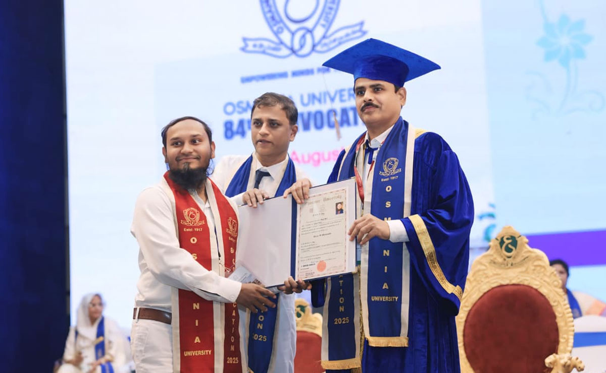 حیدرآباد: عثمانیہ یونیورسٹی نے ساجد معراج کو قانون میں پی ایچ ڈی کی ڈگری سے نوازا۔ یونیورسٹی کے 84 ویں کانووکیشن میں ڈاکٹر ساجد معراج کو وائس چانسلر کمار مولگورام کے ہاتھوں قانون میں پی ایچ ڈی کی ڈگری عطا کی گئی۔
