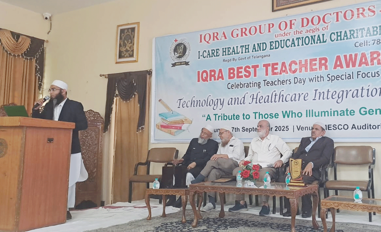 حیدرآباد: اقرا گروپ آف ڈاکٹرز کی جانب سے میسکو آڈیٹوریم، ملک پیٹ میں منعقدہ بیسٹ ٹیچر ایوارڈ تقریب میں مولانا مفتی ابوبکر قاسمی، ڈاکٹر تنزیل منور، پروفیسر سمیع صدیقی اور دیگر معزز ڈاکٹرز نے اساتذہ کو خطاب کرتے ہوئے تعلیم اور استاد کے کردار پر زور دیا۔