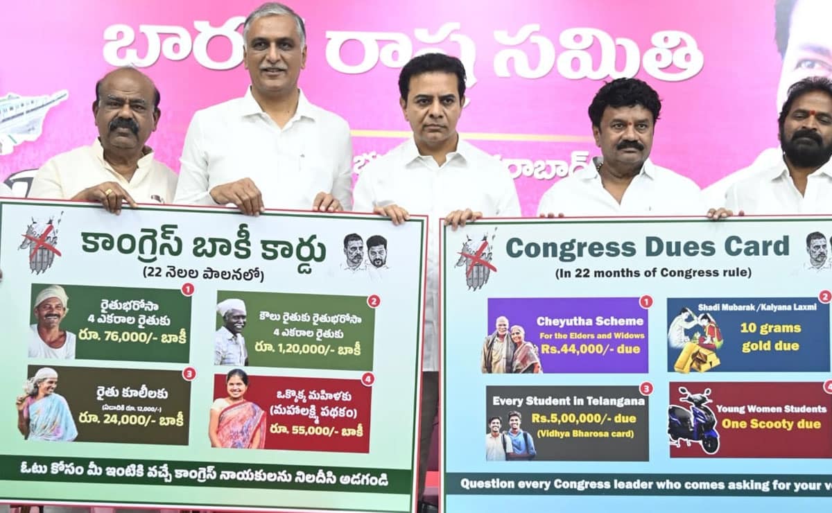 حیدرآباد: تلنگانہ کی اصل اپوزیشن بی آرایس نے ریاست کی حکمران کانگریس پارٹی پروعدوں کو پورانہ کرنے کا الزام لگاتے ہوئے ”باقی کارڈ“جاری کیا۔اس کارڈ کو پارٹی کے کارگزارصدرتارک راما راو اور سابق وزیر ہرش راؤ نے مشترکہ طور پر جاری کیا۔