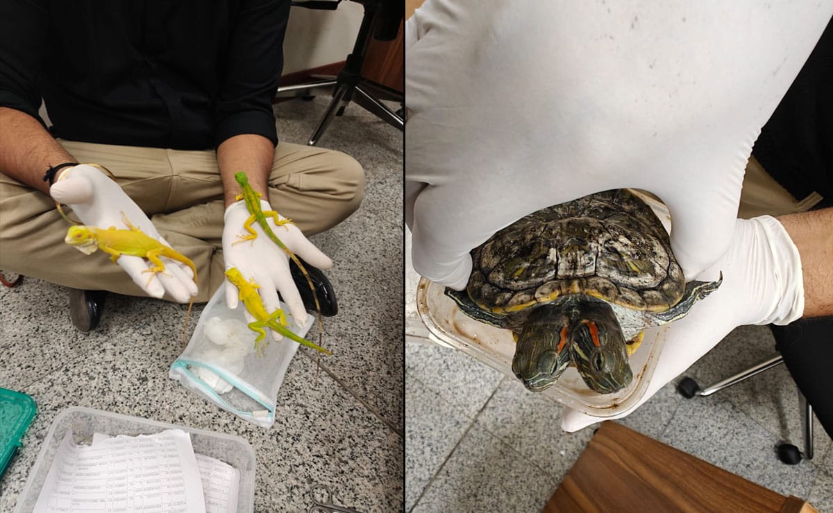 کسٹم کے حکام نے بتایا کہ اس مسافر کے سامان کی تلاشی کے دوران ایک چھپکلی،ایک کچھوا،چھپکلی نمارینگنے والے جانورضبط کیا۔یہ جانورلگیج میں چھپا کررکھے گئے تھے جس کو ضبط کرلیاگیا۔