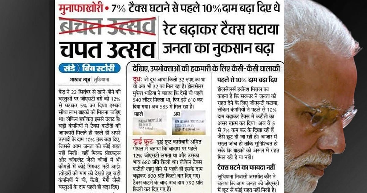 ہندی اخبار ’بھاسکر‘ کی اس خبر میں کچھ ایسے حقائق اور بیانات بھی پیش کیے گئے ہیں جو مودی حکومت کو کٹہرے میں کھڑا کرتے ہیں۔ مثلاً ایک ہول سیلر ہرکیش متل کا کہنا ہے کہ حکومت نے عوام کو راحت دینے کے لیے جی ایس ٹی گھٹایا، لیکن کمپنیوں نے پہلے سے 10 فیصد قیمت بڑھا کر ٹیکس میں تخفیف کا اثر ختم کر دیا۔ انھوں نے مطالبہ کیا کہ اس معاملے کی سخت جانچ ہونی چاہیے تاکہ صارفین کو حقیقی معنوں میں راحت مل سکے۔ لدھیانہ باشندہ جسمیت کور نے اخبار کو بتایا کہ عوام کو جی ایس ٹی میں چھوٹ سے کوئی راحت نہیں ملی ہے۔ مکھن اور دیسی گھی جیسی ضروری چیزیں پہلے ہی مہنگی ہو چکی ہیں اور اب بھی ان کی قیمتیں جوں کی توں ہیں۔ اس لیے ٹیکس گھٹانے کا فائدہ نظر نہیں آ رہا ہے۔ ڈرائی فروٹ کے ایک کاروباری امت گویل نے بتایا کہ بادام پر پہلے 12 فیصد جی ایس ٹی لگتا تھا اور اس کی قیمت 680 روپے کلو تھی۔ لیکن ٹیکس میں تخفیف نافذ ہونے سے پہلے ہی اس کی قیمت بڑھا کر 800 روپے کلو کر دی گئی۔ ٹیکس گھٹنے کے بعد اب یہ قیمت 790 روپے کلو ہو گئی ہے۔ اس طرح دیکھا جائے تو عوام کو راحت کی جگہ مہنگائی کا ہی سامنا کرنا پڑ رہا ہے۔