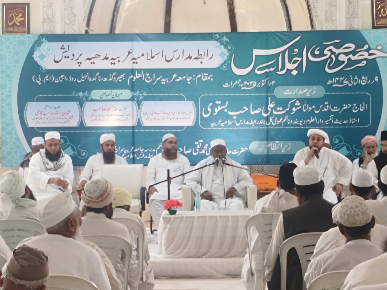 حیدرآباد ۔ بتاریخ 9/ربیع الثانی 1447ھ مطابق 02/اکتوبر 2025 بروز جمعرات بعد نماز ظہر رابطہ مدارس اسلامیہ مدھیہ پردیش کا اجلاس عمومی زیر صدارت حضرت مولانا شوکت علی صاحب قاسمی بستوی ناظم اعلیٰ رابطہ مدارس اسلامیہ و استاذ تفسیر و ادب دار العلوم دیوبند، جامعہ عربیہ سراج العلوم بھیرو گڑھ اجین میں منعقد ہوا، نظامت کے فرائض حضرت مولانا مفتی ضیاء اللہ صاحب قاسمی ناظم عمومی رابطہ مدارس اسلامیہ مدھیہ پردیش نے ادا کیے ۔