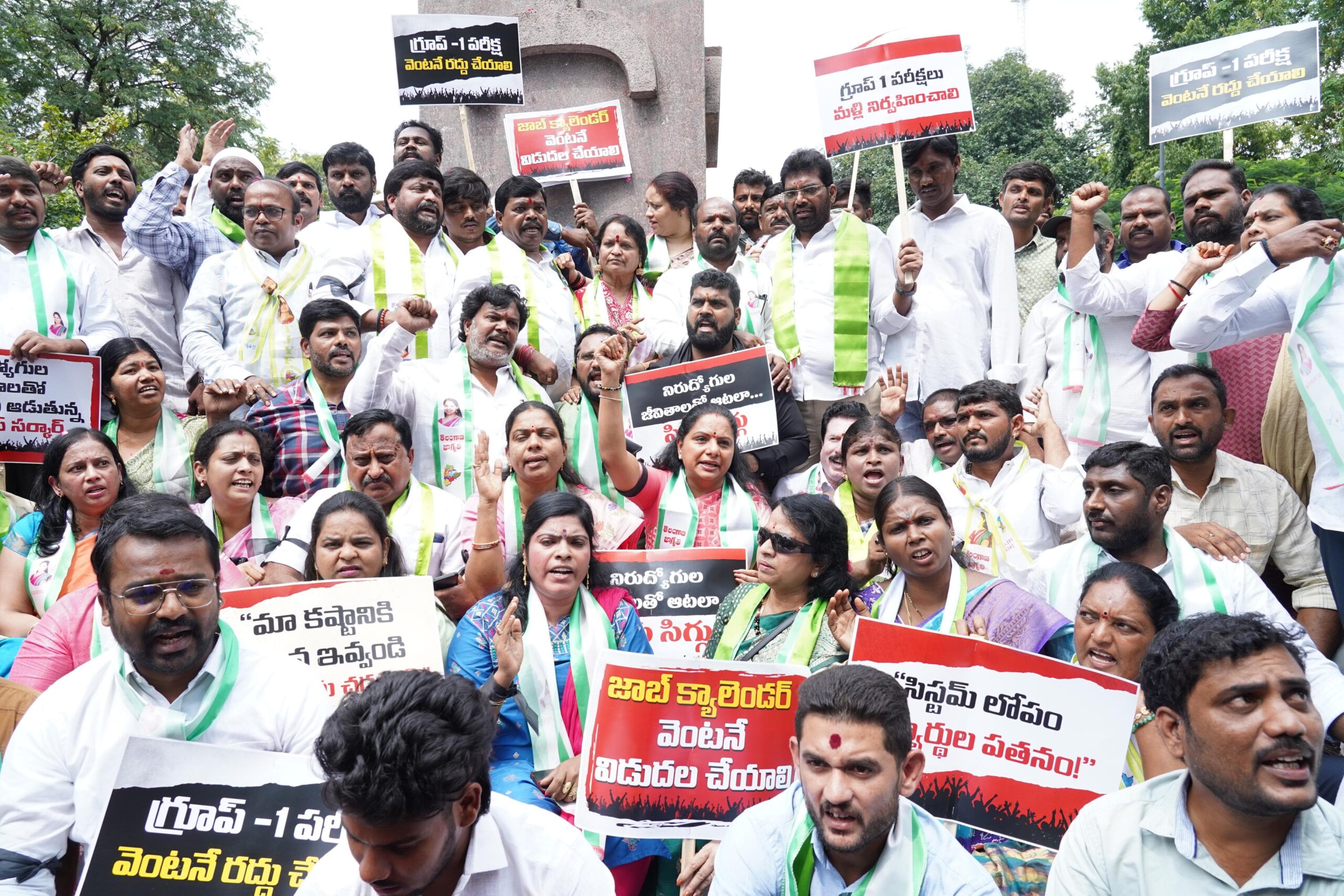 ۔ دھرنا کی قیادت تلنگانہ جاگروتی کی صدر کلواکنٹلہ کویتا نے کی۔ اس موقع پر جاگروتی کے سینکڑوں کارکنوں کے ساتھ ساتھ گروپ-1 امیدواروں نے بھی بڑی تعداد میں شرکت کی اور حکومت کے رویہ کیخلاف سخت احتجاج درج کرایا۔
