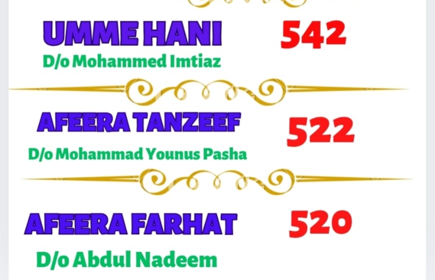 محمد عبدالرحیم صدر مدرس نو نہال ہائی اسکول کو رٹلہ کے اطلاع کے بموجب ایس ایس سی 2025 میں اعلیٰ نشانات حاصل کرتے ہوئے ضلع جگتیال میں نمایاں مقام حاصل کرنے والےنو نہال ہائی اسکول کے تین طالبات کو تلنگانہ اردو اکیڈمی کی جانب سے *بسٹ اسٹوڈنٹ ایوارڈ* کے لیے منتخب کیا گیا جسمیں *ام ہانی بنت محمد امتیاز* جنہوں نے 600 نشانات میں سے 542 نشانات حاصل کرتے ہوئے شہر کورٹلہ کے اردو میڈیم میں پہلا اور ضلع جگتیال میں دوسرا مقام حاصل کیا تھا ۔