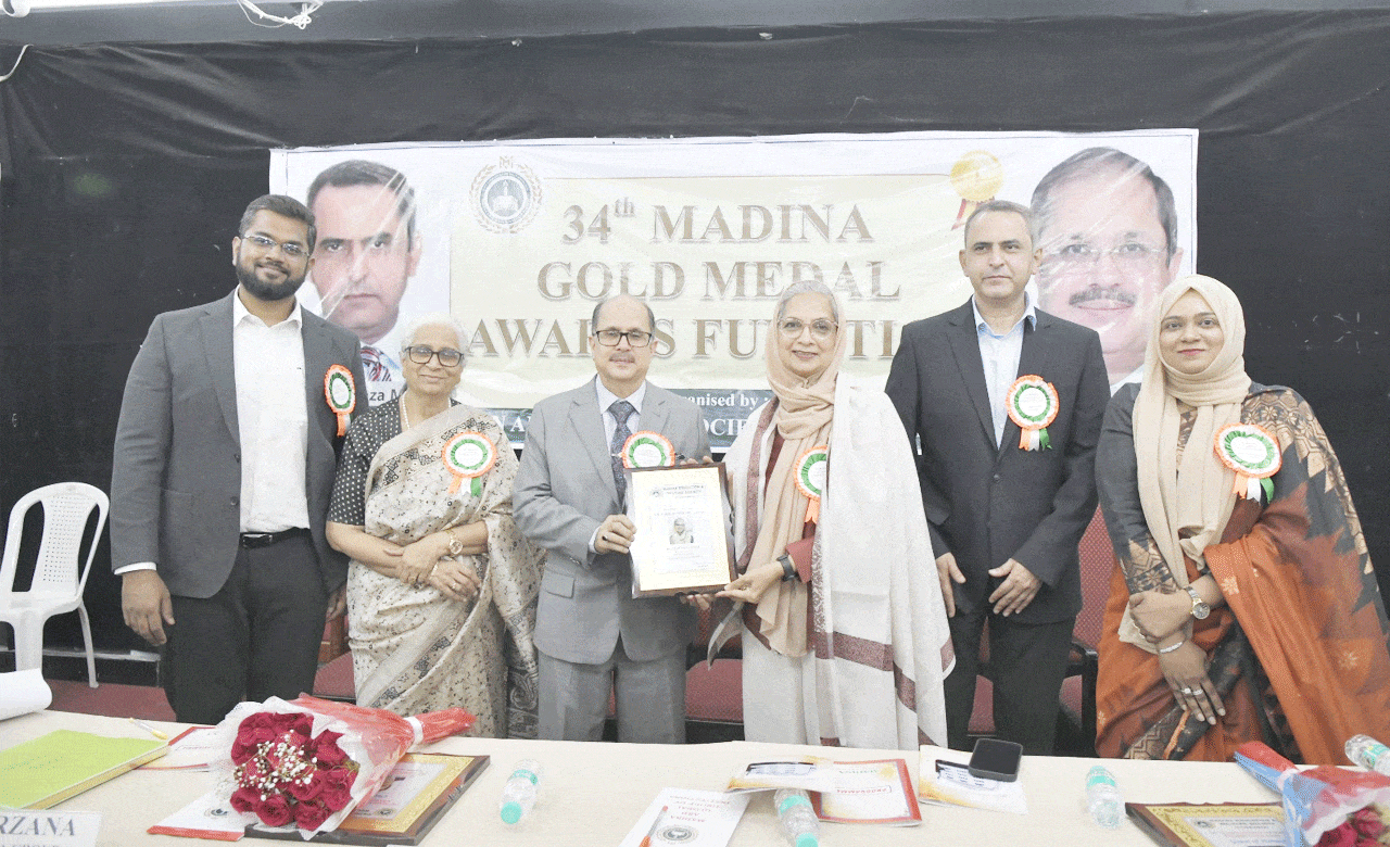 حیدرآباد: مدینہ ایجوکیشنل سوسائٹی کی جانب سے 34ویں گولڈ میڈل ایوارڈ فنکشن کا اہتمام سیدلطیف الدین ہال حمایت نگر میں منعقد کیاگیا جس میں مہمانان خصوصی کی حیثیت سے پروفیسرعلی رضا موسوی ‘ وائس چانسلر کے بی این یونیورسٹی ‘ جناب اوصاف سعید آئی ایف ایس ‘ روبینہ مظہر صفاء فائونڈیشن نے شرکت کی ۔تقریب کا آغاز قرات کلام پاک سے ہوا۔ مہمانوں کا استقبال سکریٹری محترمہ صبیحہ فرزانہ ‘ڈائرکٹرس کے ایم فصیح الدین ‘محترمہ ماریہ تبسم نے کیا ۔