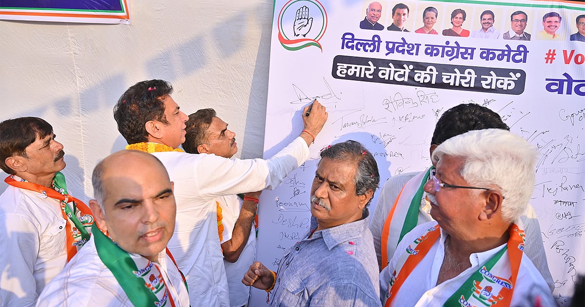 نئی دہلی: دہلی پردیش کانگریس کمیٹی کے صدر دیویندر یادو نے کہا ہے کہ ووٹ چوری کے خلاف کانگریس کی دستخطی مہم کو دہلی بھر میں مل رہی زبردست عوامی حمایت سے بھارتیہ جنتا پارٹی (بی جے پی) خوفزدہ ہو گئی ہے۔ ان کا کہنا ہے کہ اسی بوکھلاہٹ میں پولیس نے بی جے پی کے اشارے پر کانگریس کارکنوں کو زبردستی حراست میں لینا شروع کر دیا ہے۔
