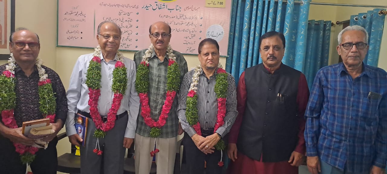 نوید جعفری نے کلام سنایا وحید پاشاہ قادری نے مزاحیہ کلام سنا کر خوب داد پائی جناب اسماعیل ذبیح نے مشاعرہ کی نظامت کی اس موقع پر پروفیسر مسعود احمد کی تخلیقات احساسات مسعود اور تخلیقات مسعود مہمانوں اور شرکاء کو بطور تحفہ پیش کی گئی معزز مہمانوں جناب سید منہاج الدین جناب اشفاق حیدر اور جناب افتخار حسین و ڈاکٹر مخدوم محی الدین کی پروفیسر مسعود احمد نے شال پوشی و گل پوشی کی
