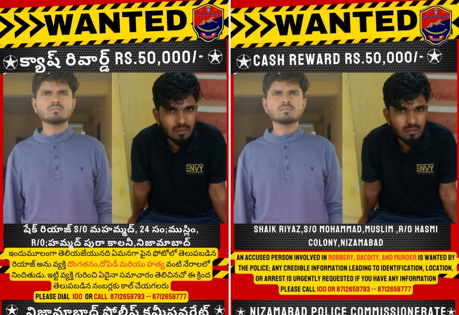 ڈیکیٹی اور،قتل کی وارداتوں میں ملوث رہا ہے کمشنر پولیس نظام آباد پی سائی چیتنیا نے اس کی گرفتاری میں اطلاع فراہم کرنے والوں کو پچاس ہزار روپے نقد رقم انعام دینے کا اعلان کیا ہے انہوں کہا کہ ملزم کسی بھی مقام پر نظر آنے پر عوام پولیس کو ڈائل( 100) یا سل نمبرات8712659793
