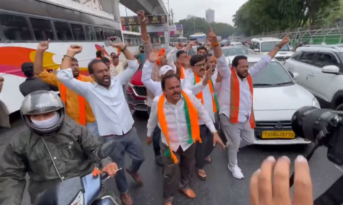 احتجاجی قائدین اورکارکن حکومت کے خلاف نعرے بازی کررہے تھے۔ان کے ہاتھوں میں بی جے پی کے جھنڈے اورپلے کارڈس تھے۔پولیس کی جانب سے احتیاطی طورپرڈی جی پی کے دفتر کے سامنے بھاری جمعیت کو تعینات کیاگیا تھا۔