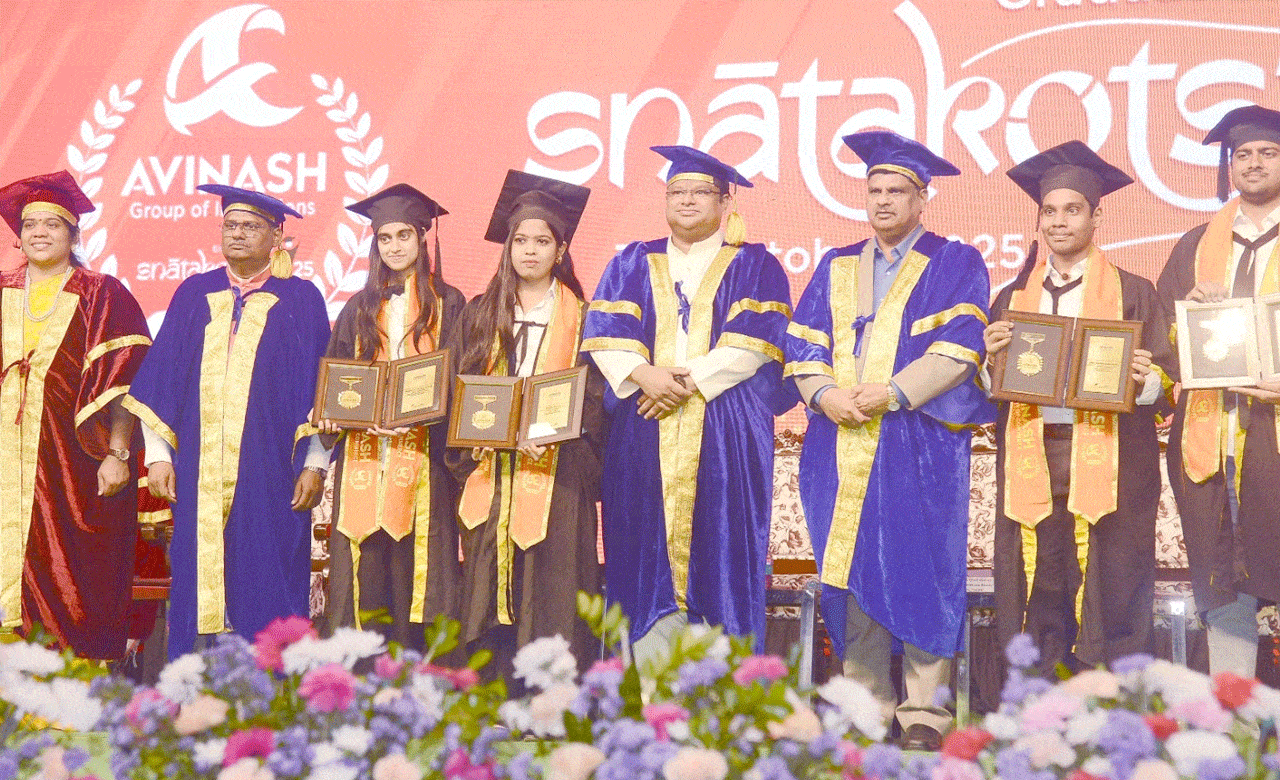 حیدرآباد: اوی نیش گروپ آف انسٹی ٹیوشنز (AGI) نے اپنی سالانہ گریجویشن تقریب “سنتکوتسو 2025” شلپاکلا ویدیکا، حیدرآباد میں شاندار پیمانے پر منعقد کی۔ اس موقع پر 2022–2025 بیچ کے دو ہزار سے زائد طلبہ و طالبات کو ڈگریاں عطا کی گئیں۔