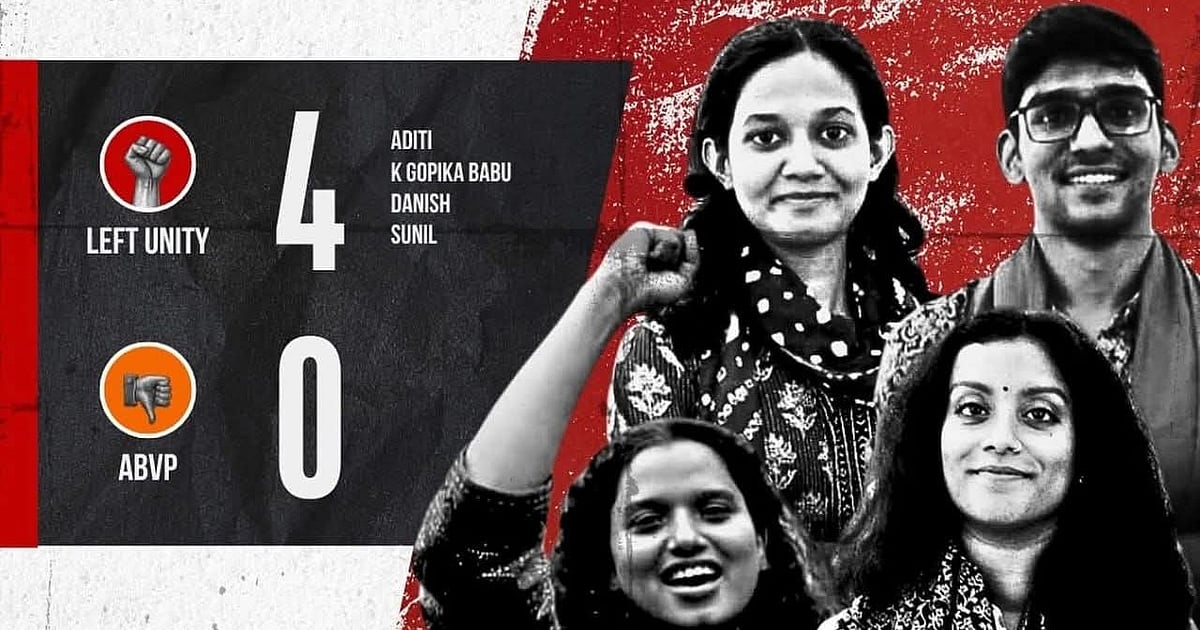 جواہر لال نہرو یونیورسٹی (جے این یو) میں طلبا یونین کے انتخاب کا نتیجہ آج برآمد ہو گیا، جو کہ اے بی وی پی، یعنی آر ایس ایس کی طلبا تنظیم کے لیے شدید جھٹکا پہنچانے والا ہے۔ جے این یو میں ایک بار پھر بایاں محاذ پارٹیوں کا اتحاد سرخرو ہوا ہے، یعنی یونیورسٹی میں ’لال پرچم‘ چاروں اہم سیٹوں پر لہرا چکا ہے۔ بایاں محاذ اتحاد نے صدر، نائب صدر، جنرل سکریٹری اور جوائنٹ سکریٹری چاروں اہم عہدوں پر اے بی وی پی امیدواروں کو واضح فرق سے شکست دی ہے۔