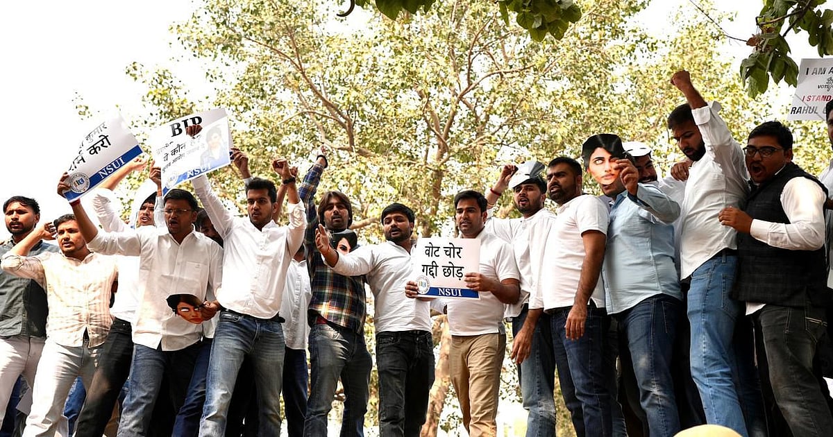 نئی دہلی: این ایس یو آئی ہیڈکوارٹر سے الیکشن کمیشن آف انڈیا کے دفتر تک آج سینکڑوں طلبا این ایس یو آئی کے قومی صدر ورون چودھری کی قیادت میں مارچ کرتے ہوئے پہنچے۔ یہ احتجاجی مظاہرہ راہل گاندھی کے ذریعہ ایک پریس کانفرنس میں ’دی ایچ فائلز‘ نام سے کیے گئے حیرت انگیز انکشافات کے بعد منعقد ہوا ہے۔ ’دی ایچ فائلز‘ کے ذریعہ راہل گاندھی نے ہریانہ میں بڑے پیمانہ پر انتخابی دھاندلی کا الزام عائد کیا تھا اور اس کے لیے بی جے پی و الیکشن کمیشن کے درمیان ملی بھگت کا دعویٰ کیا تھا۔