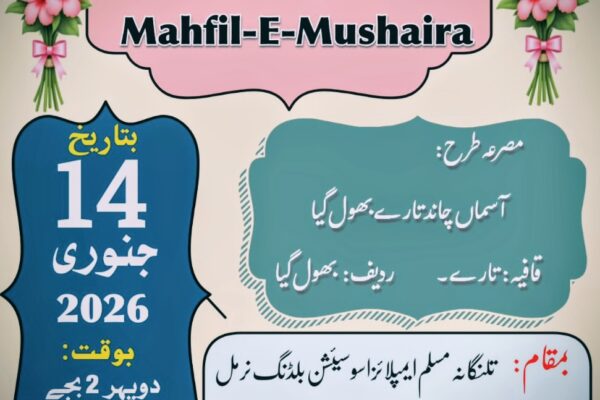 نرمل: بزم سازادب (جونیئر) اور تلنگانہ مسلم ایمپلائز اسوسیئشن نرمل کے اشتراک سے ایک طرحی مشاعرہ منعقد کیا جارہا ہے…
