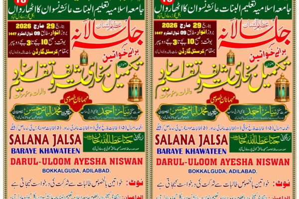 Oplus_131072 عادل آباد، 27 مارچ (نمائندہ خصوصی/ خضر یافعی)شہر عادل آباد کے معروف دینی ادارہ جامعہ اسلامیہ تعلیم البنات عائشہ…