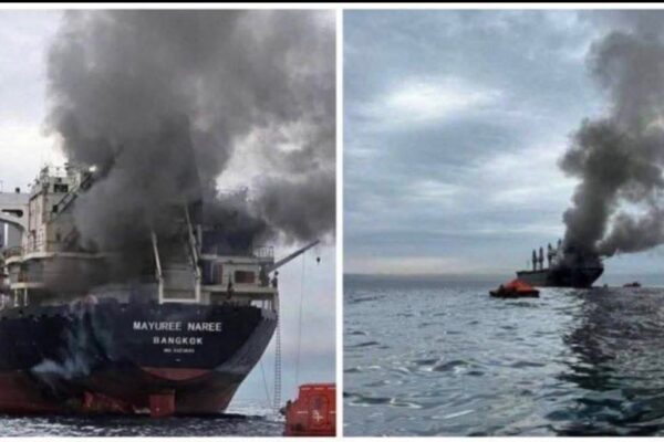 Oplus_131072 بھارت کے گجرات کی جانب آنے والے ایک تھائی کارگو جہاز پر چہارشنبہ کے روز آبنائے ہرمز کے قریب…