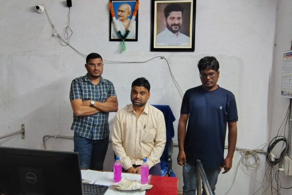 تلنگانہ کے جگتیال ضلع کے میٹ پلی سب رجسٹرار آصف الدین، اسسٹنٹ ڈاکیومنٹ رائٹر آرمور روی، اور آفس کے آؤٹ…