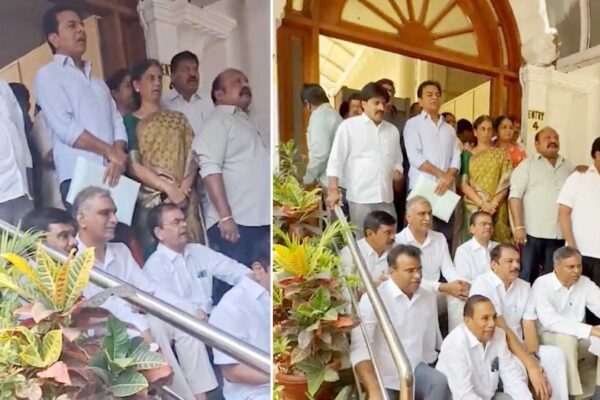 احتجاج کے دوران بی آر ایس کے اراکین اسمبلی نے اسمبلی کے داخلی دروازے پر دھرنا دیا اور نعرے لگائے…