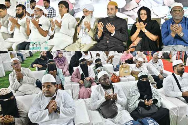 عازمین حج کے قافلہ کی روانگی سے قبل مفتی خلیل احمد دعا کرتے ہوئے۔ تصویر میں صدرنشین حج کمیٹی خسرو…