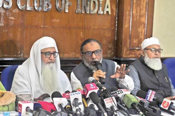 مسلم پرسنل لا بورڈ کے رہنماؤں مولانا فضل الرحمن‘ مولانا محمد شفیع اور ڈاکٹر قاسم رسول الیاس پریس کانفرنس سے…