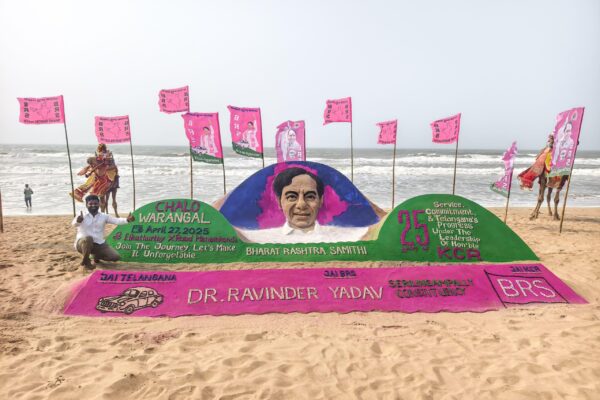 اڈیشہ کے پوری بیچ پر کے سی آر کی ریت کی مورتی کی بذریعہ آن لائن کویتا کے ہاتھوں رونمائی