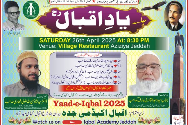 حیدرآباد ۔ کے این واصف جدہ مین “جلسہ بیاد اقبال” کا انعقاد۔ جنرل سکریٹری اقبال اکیڈمی جدہ (بیرونی شاخ)کی اطلاع…