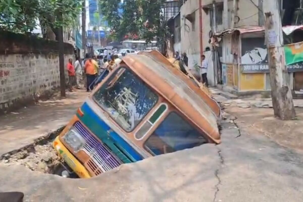 حیدرآباد۔ بڑی سڑک دھنس گیی۔ٹینکر کا اگلا حصہ دھنسے ہوئے حصے میں پھنس گیا حیدرآباد: حیدرآباد کے پوش علاقہ بنجارہ…