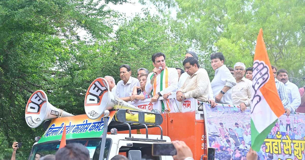 اسمبلی گھیراؤ کے دوران کانگریس کارکنان ہاتھوں میں جھونپڑیوں کو اُجاڑنے کے خلاف تختیاں اور بینر لیے نعرے لگاتے ہوئے…