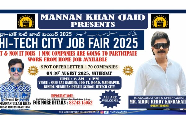 حیدرآباد میں ہائی ٹیک سٹی جاب فیئر 2025 منان خان کی جانب سے منعقد ہو رہا ہے، جس کی حمایت…