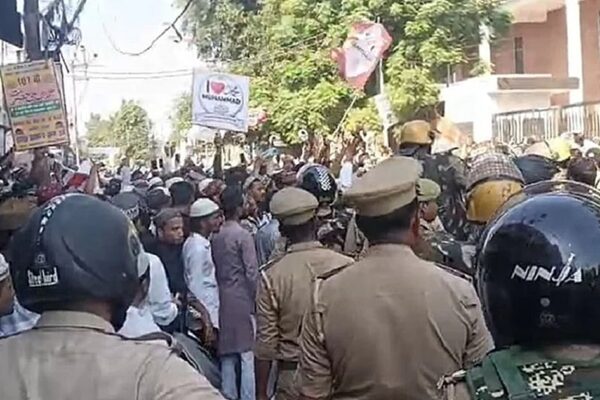 بریلی: یوپی کے بریلی شہر میں جمعہ کی نماز کے بعد ایک مسجد کے باہر ’آئی لو محمدؐ‘ کے بینر…