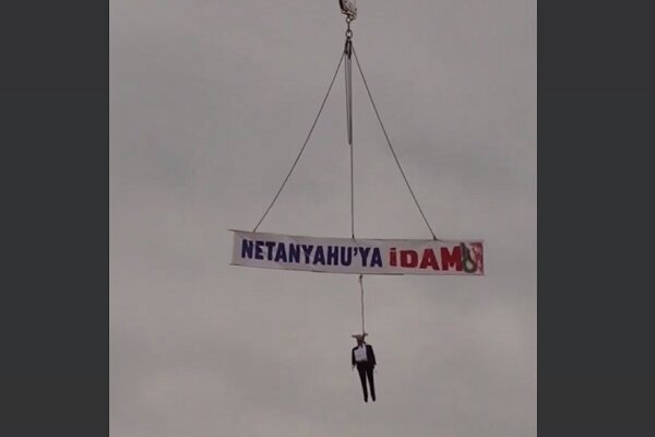 ترکی کے شہر ترابزون میں ایک تعمیراتی سائٹ پر مزدوروں نے کرین پر اسرائیلی وزیرِ اعظم نتانیاہو کا پتلا لٹکا…