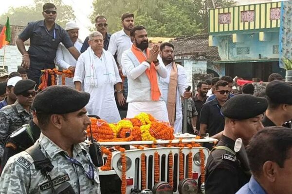 مکامہ میں پیر کے روز جے ڈی یو کے امیدوار اننت سنگھ کے حق میں مرکزی وزیر للن سنگھ اور…
