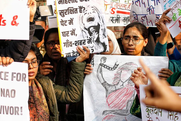 مظاہرے کے دوران اس وقت کشیدگی پیدا ہو گئی جب کلدیپ سنگھ سینگر کے حق میں ایک خاتون بینر لے…