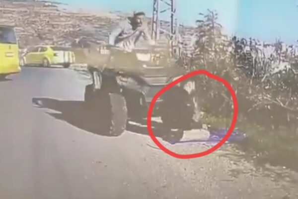 Oplus_16908288 اسرائیل کے ایک فوجی نے اپنے اے ٹی وی گاڑی سے سڑک کنارے نماز ادا کرتے ہوئے ایک فلسطینی…