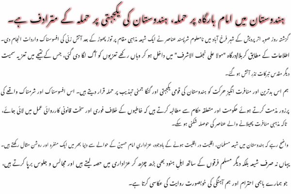 *مذمتی بیان* بسم اللّٰہ الرحمٰن الرحیم *ہندوستان میں امام بارگاہ پر حملہ، ہندوستان کی یکجہتی پر حملہ کے مترادف ہے۔*…