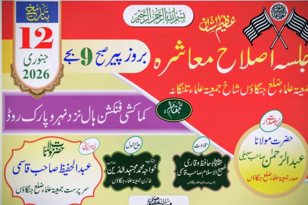 جنگاوں۔ محمد خواجہ مجتہد الدین ، ناظم شعبہ اصلاح معاشرہ جمعیت علماء ضلع جنگاؤں کے بموجب ایک عظیم الشان جلسۂ…